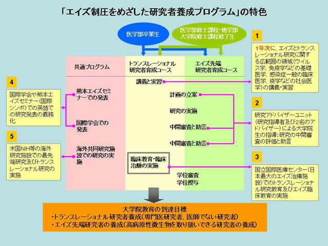 HIV-1(エイズウイルス)感染者が世界で4000万人以上になり、毎年300万人以上が死亡している。国内においても、既にHIV-1感染者は1万人以上に達しており、感染の急速な増大が危惧されている。このような状況下で、基礎研究成果を基にエイズの治療薬や治療法の開発まで行うトランスレーショナル研究の専門家の育成が、エイズを制圧するために急務とされる。そこで最もエイズの研究教育実績がある熊本大学医学教育部に、「エイズ制圧を目指した研究者養成コース」を新設し、国内外から大学院学生を受け入れて組織的な大学院教育を実施し、トランスレーショナル研究を推進する能力を有した研究者・エイズ専門医の育成、さらにHIV-1などの高病原性微生物の取り扱う能力を備えた研究者の育成を行う。 @ 「エイズ制圧のためのトランスレーショナル研究者育成コース」と「エイズ先端研究者育成コース」の2のサブコースを設置する。 A エイズに関する幅広い分野とトランスレーショナル研究に関する講義、日本最大のP3施設を使用した様々な研究方法に関する実習を行い、エイズ研究を行うための基礎的知識と技術の習得を初期に行う。さらに医師である大学院学生が進むコースでは、日本最大のエイズ治療病院である国立国際医療センターもしくは熊本大学病院で、エイズ治療に関する臨床教育と臨床治験を研修できるプログラムを、医師でない学生が進むコースでは、病棟などでのエイズの臨床を体験するプログラムも取り入れ、体系的な教育システムを構築する。また研究で優秀な成績をあげている学生が、指導教員の海外共同研究者の研究室で研究を行うことができるプログラムを作成し、国際的視野を持った研究者の養成をする。 B 指導教員と2名の研究アドバイザーによるアドバイザーユニットをつくり、学生の研究を定期的に審査し、研究が順調に進むようにアドバイスするシステムを作る。またプログラム運営委員会を設置し、プログラムの運営を行う。 以上の組織的教育プログラムにより、幅広い知識と基礎・臨床研究の専門性を備えたエイズ研究者の育成が期待できる。また本プログラムが、トランスレーショナル研究が重要な他の分野での研究者の育成の大学院教育の改善にも貢献できる。 |